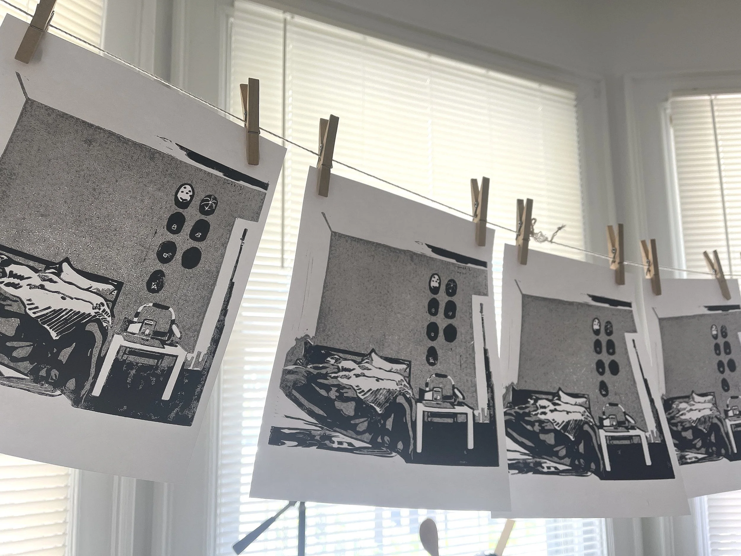 Martha W. Roussell Work Liminal PlacesLost PetsFisherman's WharfPer's ScribblesNew England TreesMisc. / Commissions About Contact Scranton, 2024, Linocut prints, 8x8 inches